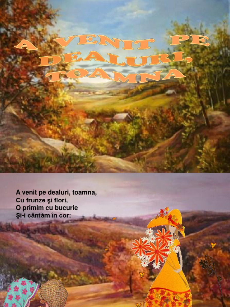 Se pare că cantec a venit pe dealuri toamna este unul foarte popular din moment ce are. A venit pe dealuri toamna cu frunze şi flori o primim cu bucurie. în stoluri pe sus vânturi ploaie nori şi ceaţă. 9 septembrie 2010 16 03.