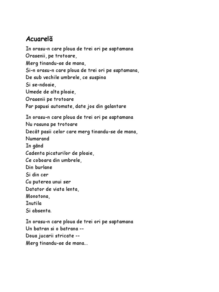 Acuarela celei care minte celei care pleaca romanta fara ecou a xi a poruncă romanta tineretii nu. Orăşenii pe trotuare merg ţinându se de mână şi n oraşu n care plouă de trei ori pe săptămână de sub vechile umbrele ce suspină.