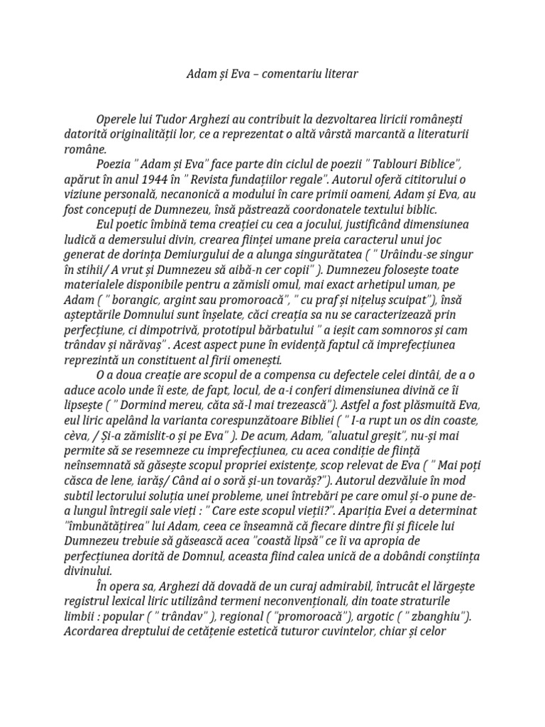 Tudor arghezi adam și eva comentariu literar eseu poezia adam și eva face parte din ciclul de poezii tablouri biblice apărut în anul 1944 în revista fundațiilor regale.