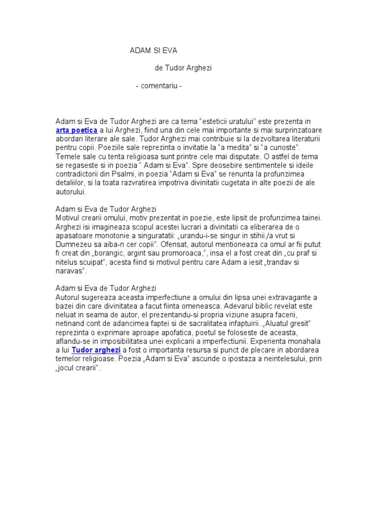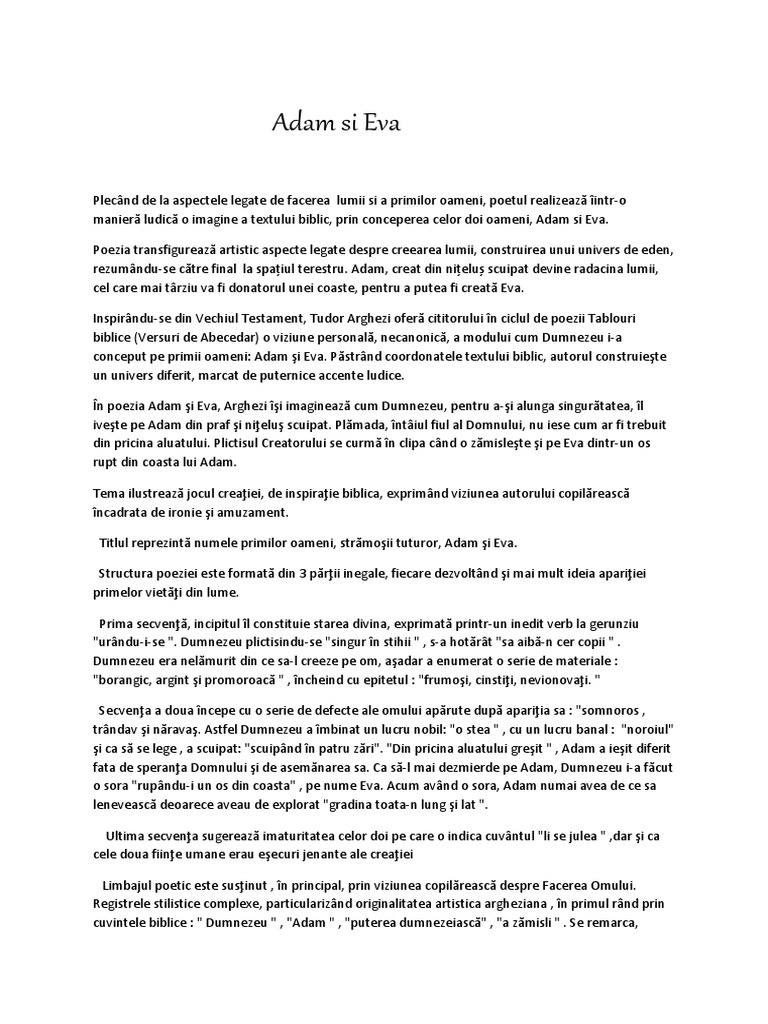 De tudor arghezi comentariu poezia adam și eva este o prezentare a creației cu o tentă alegorică. Astfel poezia de față este un text expresiv datorită imaginilor create a figurilor de stil și a limbajului specific ar. Urandu i se singur in stihii a vrut si dumnezeu sa aiba n cer copii si s a gandit din ce sa i faca din borangic argint sau promoroaca frumosi cinstiti nevinovati. Urându i se singur în stihii a vrut și dumnezeu să aibă n cer copii.