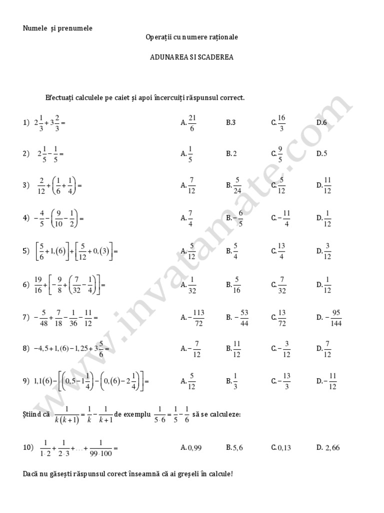 în această lecție vom discuta despre adunarea și scăderea numerelor raționale scrise sub formă de fracții ordinare. A vi a d 16 martie 2020 12 16 0 stele 0 review uri. 0 stele 0 review uri. Scăderea numerelor raționale recuperare cls.