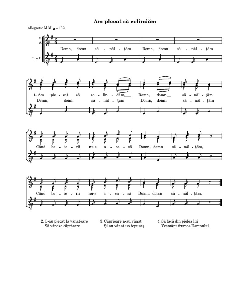 Am venit sa colindam. Am plecat sa colindam domn domn sa naltam cand boierii nu s acasa domn domn sa naltam c au plecat la vanatoare domn domn sa naltam sa vaneze caprioare domn domn sa naltam caprioare n au vanat domn domn sa naltam si au vanat un iepuras domn domn sa naltam sa faca din pielea lui domn domn sa naltam vesmant frumos domnului domn domn sa naltam. Nu va mai vaitati ca inainte primeau nuci si coji de cartofi ca nici voua nu v ar conveni sa va duceti la serviciu si sa va dea un sir de covrigi in loc de bani. Nu stiu cati dintre voi au nostalgia copilariei cand plecam colindat pe un ger de crapau pietrele si nameti mai mari decat noi sa le anuntam bunicilor unchilor si matusilor ca se apropie nasterea lui hristos. A trecut s a dus s a dus cu amintiri nenumarate speram la anul tot la fel de minunate.