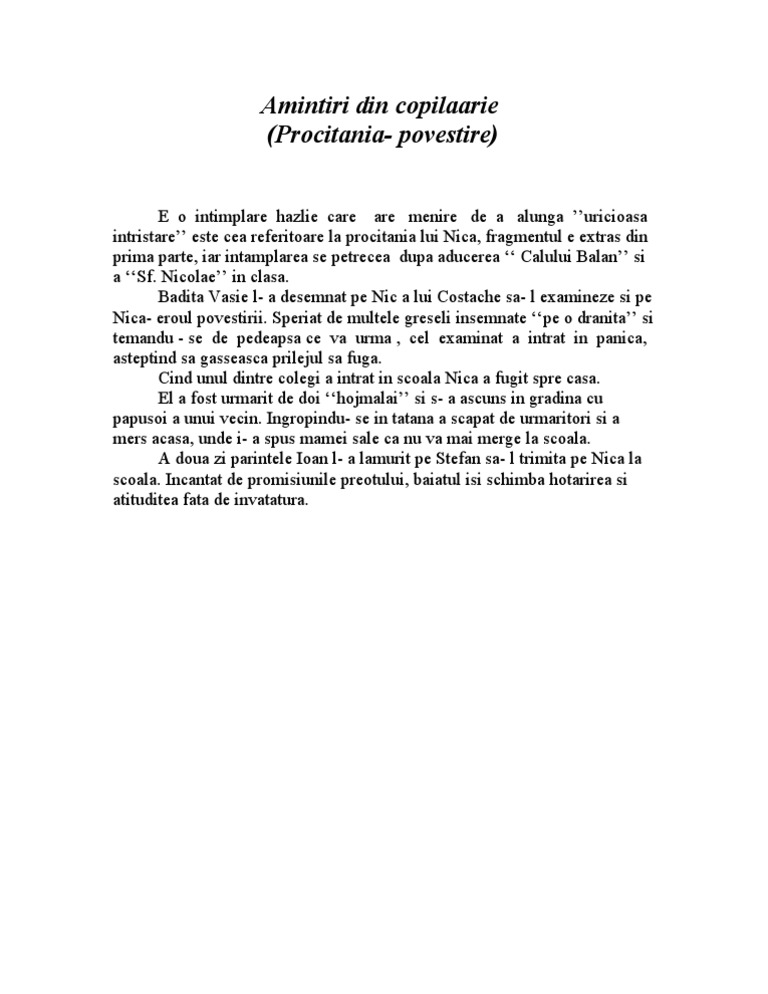Acesta reuseste sa cuprinda actiunea importanta a textului. Prima parte din povestea amintiri din copilărie incepe cu plecarea la scoala a lui nica si cuprinde si povestirea denumita caprele irinucai. Este bun pentru a te inspira sa faci un rezumat mai lung. Copiii nu inteleg rostul scolii sunt indaratnici si de aceea.