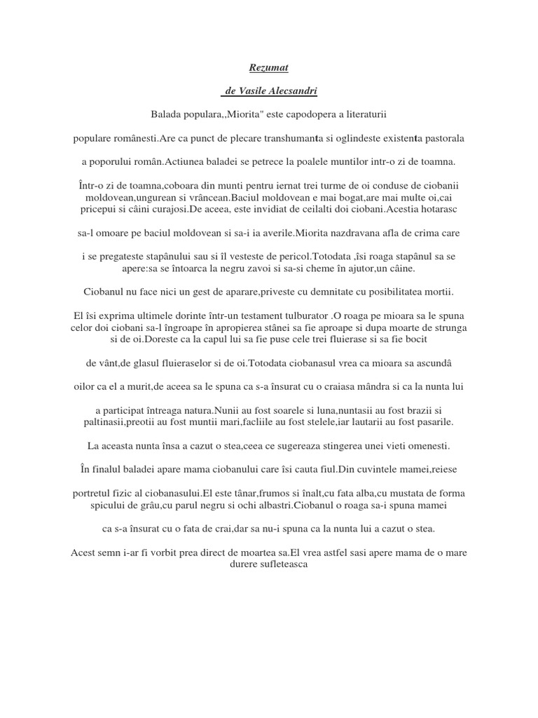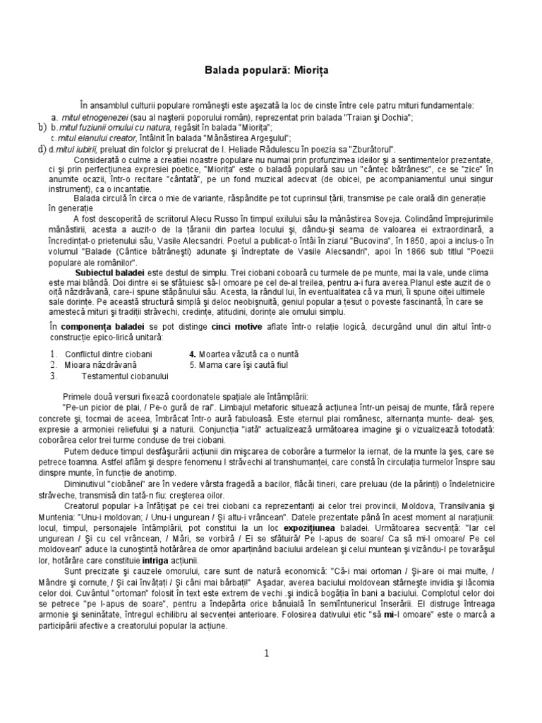 Argumentare balada populara miorita. Actiunea este simpla si lineara desfasurata pe un singur plan si organizata pe momentele subiectului. Produse moderne de invatare pentru clasa a viii a. Balada populară mioriţa are drept titlu diminutivul animalului năzdrăvan cu un rol determinant în declanşarea ideii filozofice ce a eternizat opera în literatura naţională. Balada miorita este o creatie populara in versuri cu subiect realo fantastic in care se consemneaza fapte ganduri experiente ale unor eroi exemplari surprinsi in momente de exceptie.