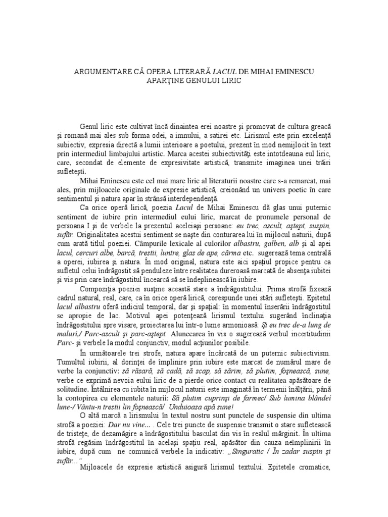 Genul liric argumentare lacul de mihai eminescu redactează o compunere de 150 200 de cuvinte în care să motivezi apartenenţa textului la genul liric. Argumentarea că opera literară lacul de mihai eminescu aparține genului liric. şi eu trec de a lung de maluri parc ascult şi parc aştept ea din trestii să răsară şi să mi cadă lin pe piept. 0 stele 0 review uri.