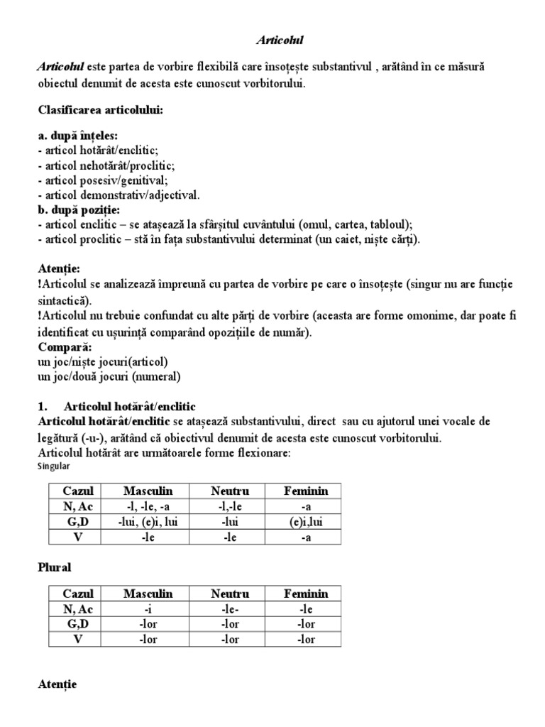 Articolul hotarat si nehotarat. Un o unui unei niște unor. Articolul hotărât se scrie cu cratimă în locul unde se face sudura când se citează fără substantivul la care e alipit. Cu exceptia celui hootarat care spre deosebire de limba romana nu se pune la finele substantivului lucrurile seamana cu limba romana. De asemenea substantivele la plural nu sunt precedate de artiol nehotarat.