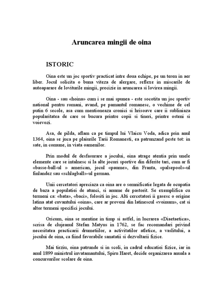 Postări atom persoane interesate. In 1899 spiru haret the minister of education decided that oină was to be played in schools in physical education classes. Aruncarea mingii de oina de pe loc. Aruncarea mingilor la ţintă de la linia de aruncare marcată pe sol la o distanţă de 20 de metri de poarta de handbal se aruncă patru mingi diferite oină handbal baschet şi volei.